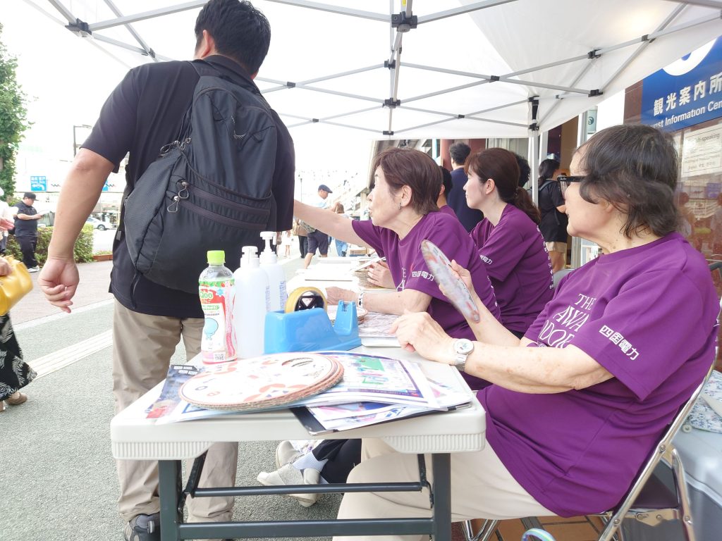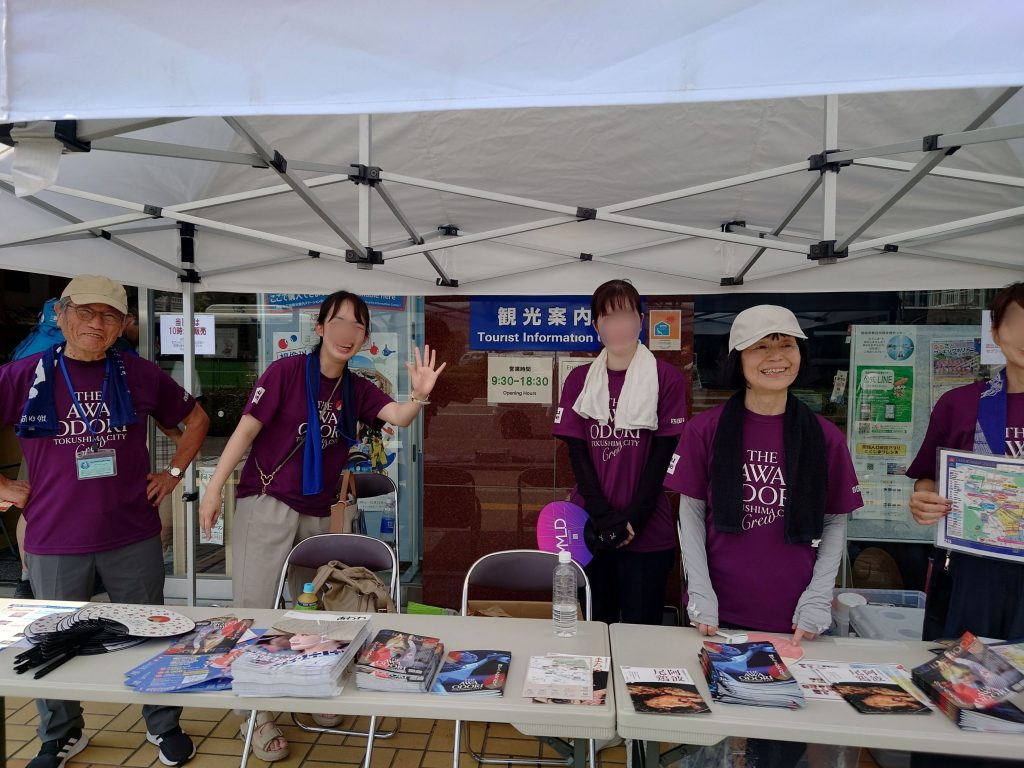 万博効果で、今年はヨーロッパからのインバウンドも目立ちました。英語で演舞場や入場券売り場、阿波おどり会館などを案内したほか、みやげ物店やひょうたん島クルーズなども案内しました。また時には「どこから来たのですか?」などと尋ね、外国人とひとときの英会話を楽しみました。