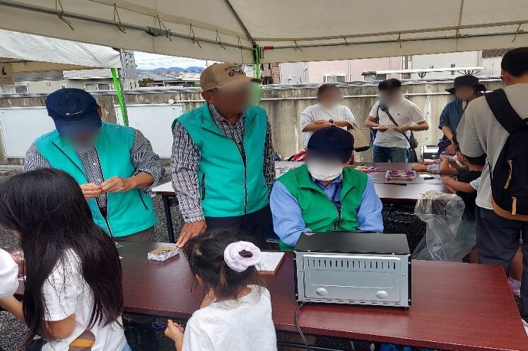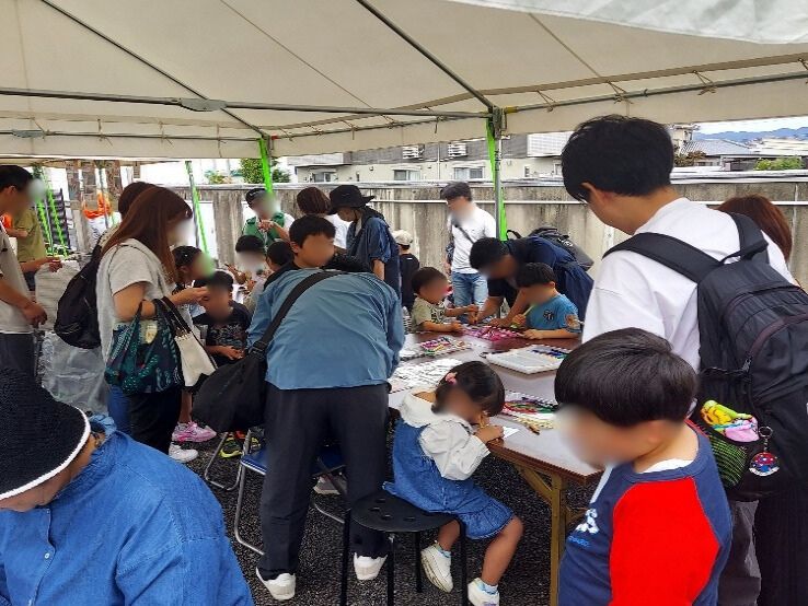 フェスタ開始と同時に防災工作に親子連れが殺到し、「防災キーホルダー」のプラバン作成に皆さん一生懸命に取組んで好きなキャラクタを描き、それをトースターで加熱すると収縮するのを驚いたようすで見ていました。そして自分のキーホルダーを手にして喜ばれていました。「ポリ袋で作るレインコート」は準備していましたが、プラバン作成に大勢が集まり、今回は実施する機会がありませんでした。