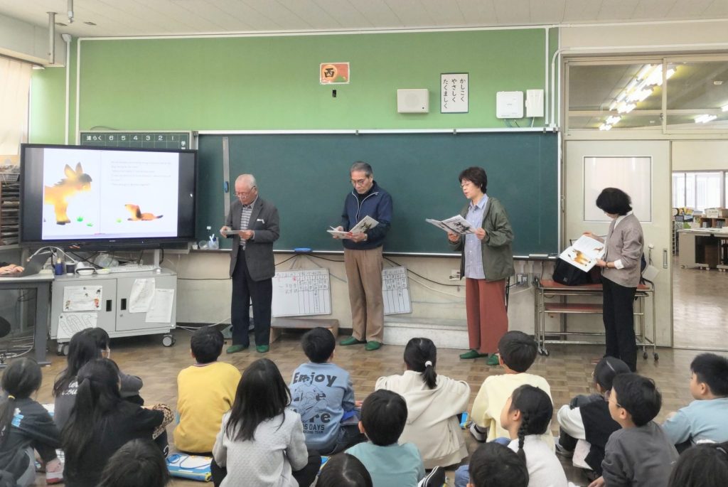 今回は徳島駅から約30分、周囲にのどかな田園風景が広がる渋野小学校を訪問しました。予定より早く到着したので校長先生に貴重なお話を聞くことができました。渋野小学校ではICT教育に熱心に取り組んでおられるとのことでした。3年生の教室に案内されると1組と2組の生徒約40名のかわいい出迎えを受け、はじめに会員が簡単に英語と日本語で自己紹介をしました。濱尾リーダーの釣りの話題に釣り好きの生徒が「僕もお父さんと一緒にいくよ」とすぐに興味を示してくれました。