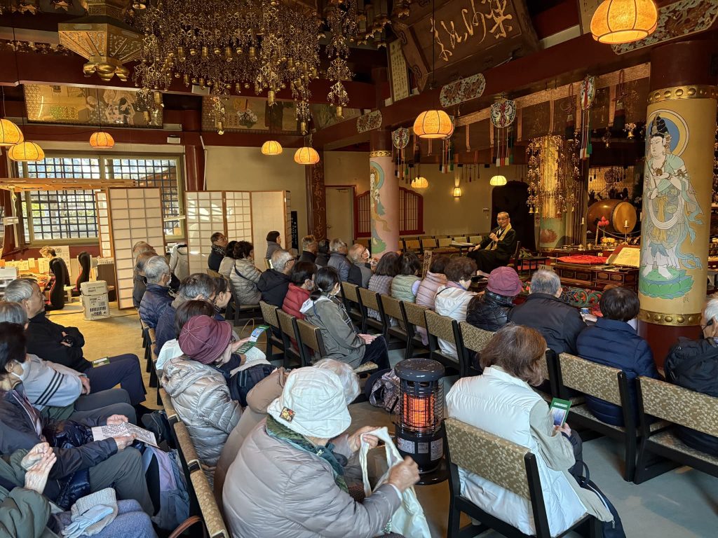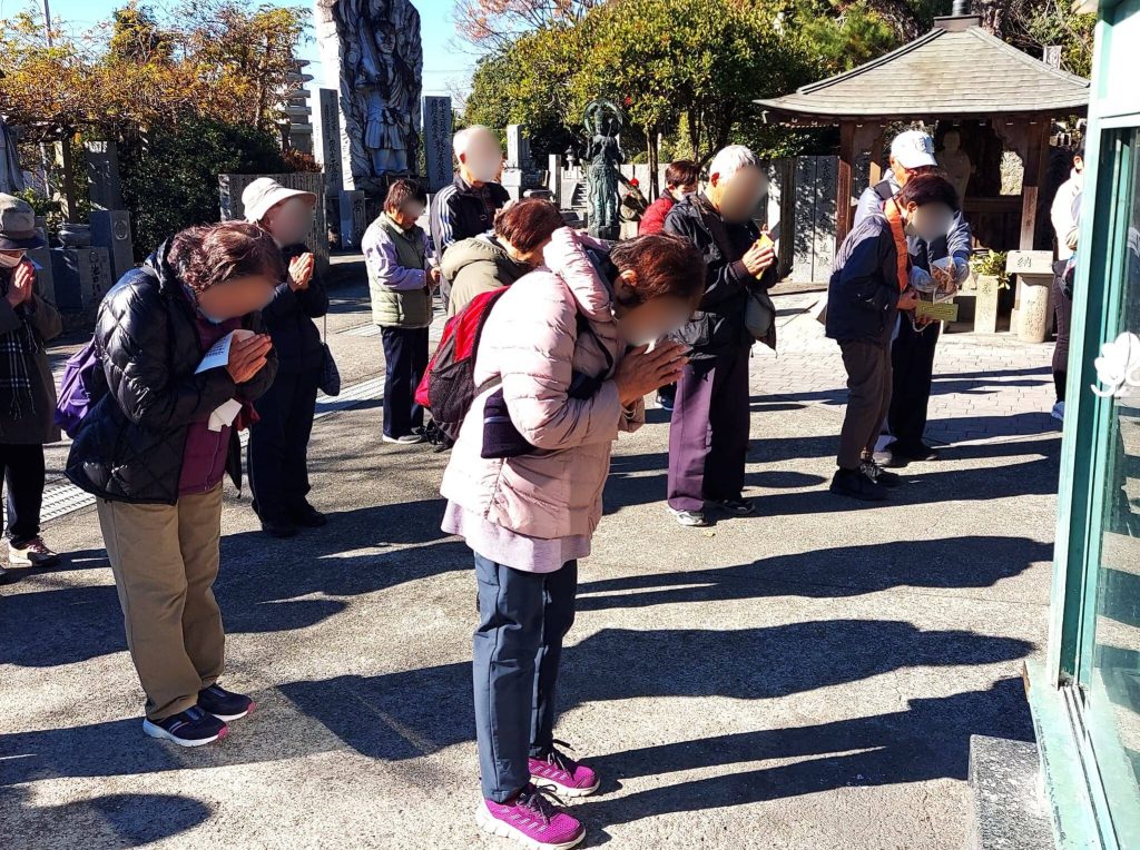 「歩き遍路」安楽寺~十楽寺まで、お先達(ICT17期:古田さん)を先頭に、初冬を感じながら1.2㎞をゆっくりと歩きました。十楽寺では、お先達さんから作法を聞いて皆さん本堂、大師堂と参拝をして般若心経を読経しました。