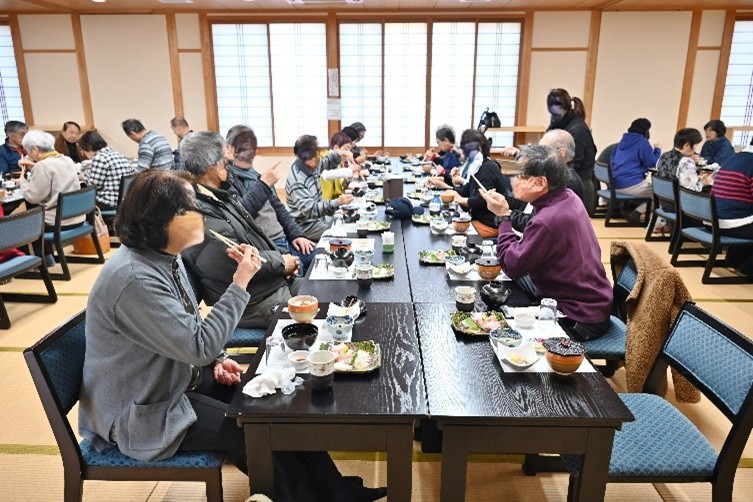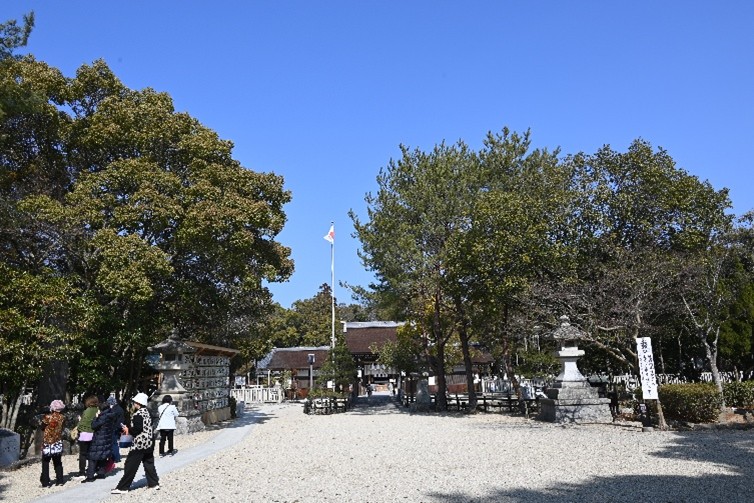 日本最古とも紹介されている神宮で、花崗岩の鳥居は日本最大です。全員で写真撮影し、「陽の道しるべ」を見て拝殿でお参りしました。その後は夫婦楠などを各自散策しバスに集合して昼食へ出発。